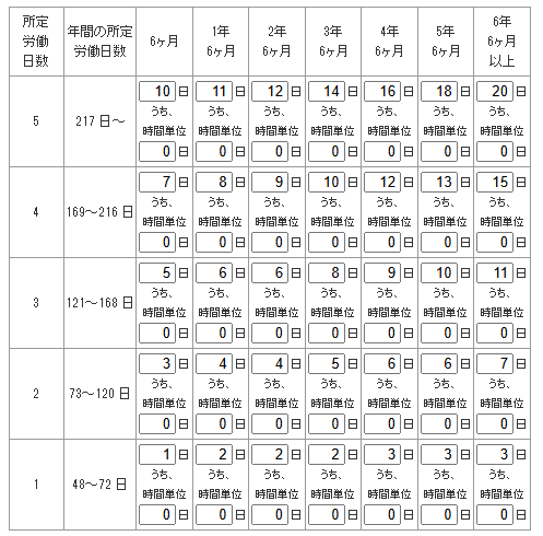 | 8 | 付与日数と時間単位で取得できる限度日数 | ※週1勤務の場合 初年度6か月(入社6か月後)⇒1日 2年目6か月(入社1年6か月後)⇒2日 3年目6か月(入社2年6か月後)⇒2日 4年目6か月(入社3年6か月後)⇒2日 5年目6か月(入社4年6か月後)⇒3日 6年目6か月(入社5年6か月後)⇒3日 7年目6か月(入社6年6か月後)⇒3日 8年目6か月(入社7年6か月後)⇒3日 ※9年目6か月以降は8年目6か月と同様の日数が付与されます ※週2~4勤務の場合も法令通りに入力します |